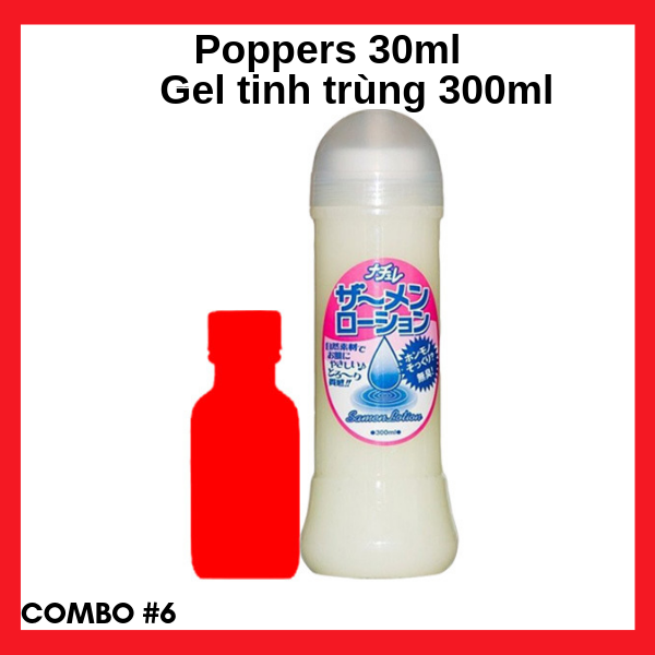 Combo #6 bao gồm một chai poppers 30ml cao cấp mạnh mẽ và gel bôi trơn tinh trùng Nhật Bản 300ml.